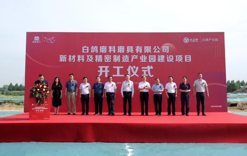 2023年7月6日上午,白鸽磨料磨具有限公司新材料及精密制造产业园举行了隆重的开工仪式。荥阳市委书记杨金军,先进制造业开发区党工委书记、管委会主任李献武,市委常委、副市长刘成伟,市人大常委会副主任靳西峰,市政府副市长、金寨乡党委书记张俊海,先进制造业开发区副主任张海庆、先进制造业开发区副主任赵红星,白鸽磨料磨具有限公司党委书记、董事长李勇刚,中国机床工具工业协会磨料磨具分会秘书长陈鹏,超硬材料分会秘书长孙兆达、涂附磨具分会秘书长陈远东、浙商银行郑州支行行长邵晓等共同出席了开工仪式,仪式由张海庆主持。